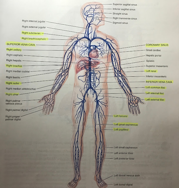 - veins= blue except at the heart
