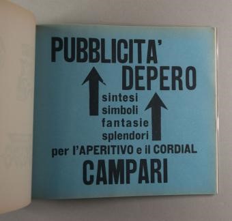 | bolted book- depero 80 page catalog of advertising designs/possibilities fighting convention multicolor text, new typefaces, diff types of paper |